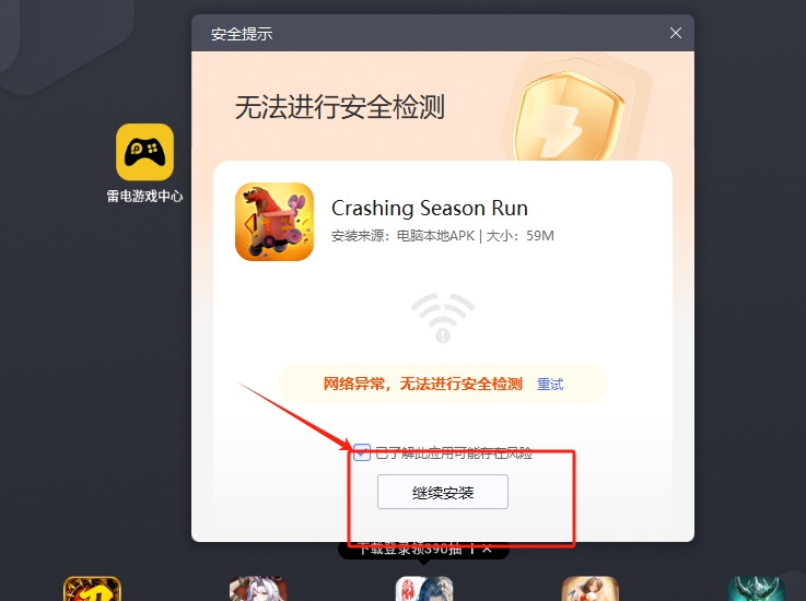 3、将崩溃季节运动apk拖入到雷电模拟器,点击已了解此应用,再点击继续游戏即可进入游玩。