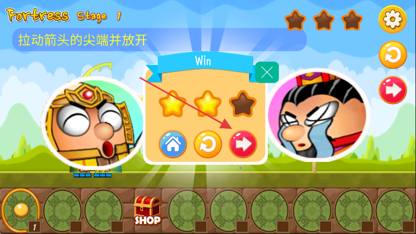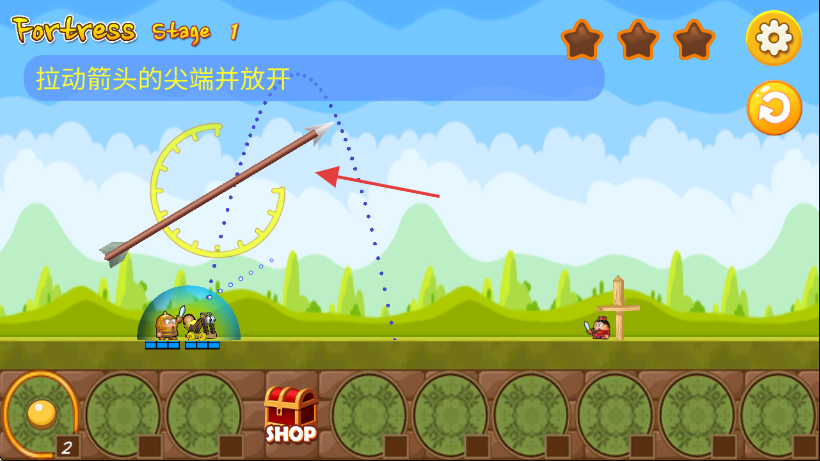2、在【Fortress Stage1】关卡中,按照提示【拉动箭头的尖端并放开】来进行操作攻击目标。