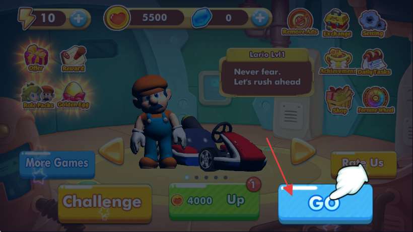 1、进入游戏界面后,点击【GO】按钮开启赛车挑战,做好比赛准备。