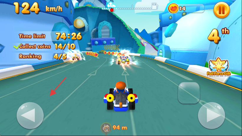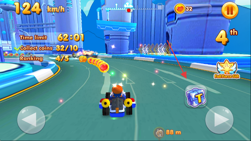 2、在赛道行驶时,通过左下角按钮操控赛车方向,同时收集金币并留意时间限制。