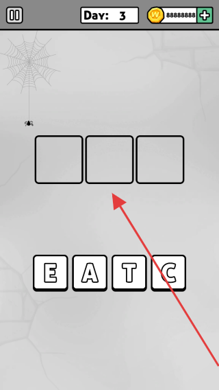 3、到游戏第3天,面对字母填空题目,从下方字母(如【E A T C】)中选择合适的填入方框,完成拼写任务,获取游戏奖励。