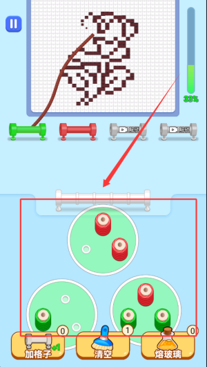 4、支架解锁策略,完成指定消除次数可解锁旋转支架,倾斜设备改变毛线下落轨迹,利用重力辅助完成立体织物编织。