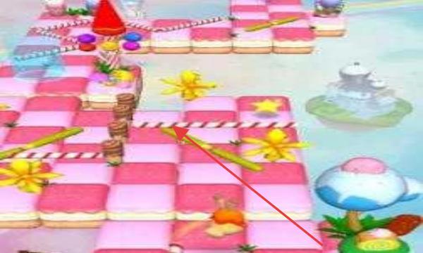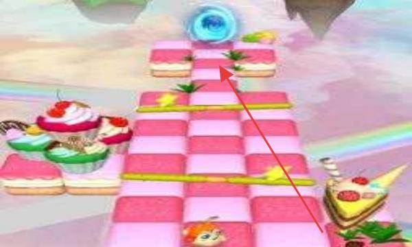 2、沿箭头指向的粉色方格道路前进,朝着蓝色光圈方向移动,注意躲避周围甜点造型的陷阱,顺利抵达目标点。
