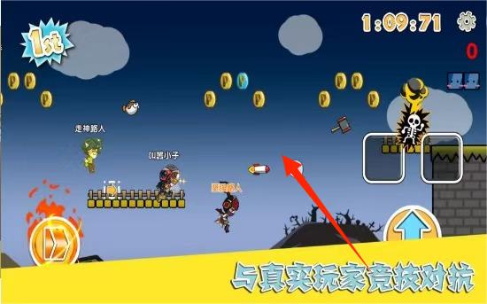 1、进入游戏场景,操控角色在平台间移动,收集金币,与真实玩家展开竞技对抗。