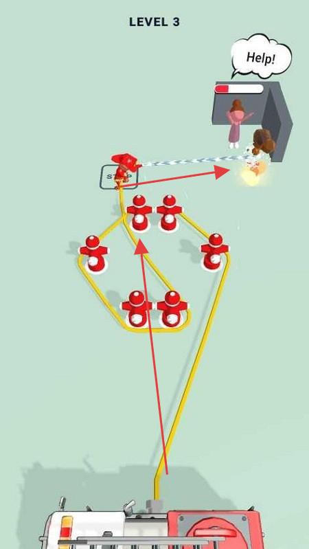 2、玩家通过操作,控制红色小人沿着黄色水管路径移动,避开如“STOP”标志、灰色小人等障碍,成功到达被困者处。