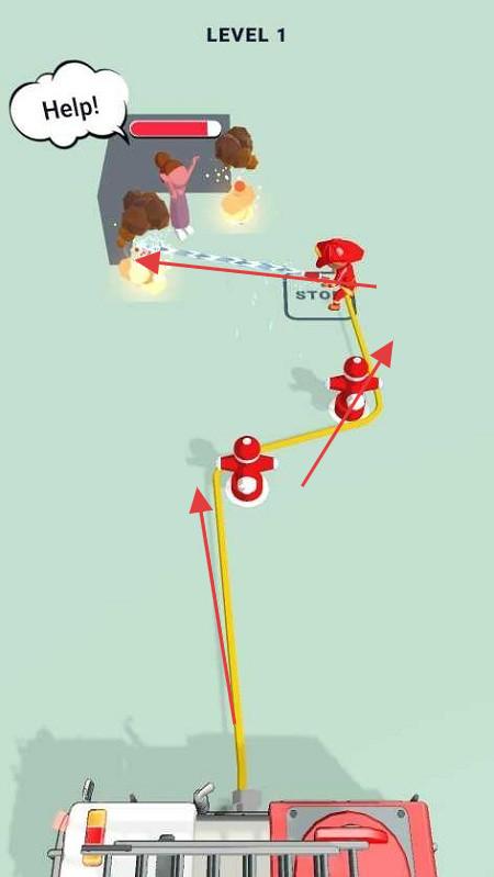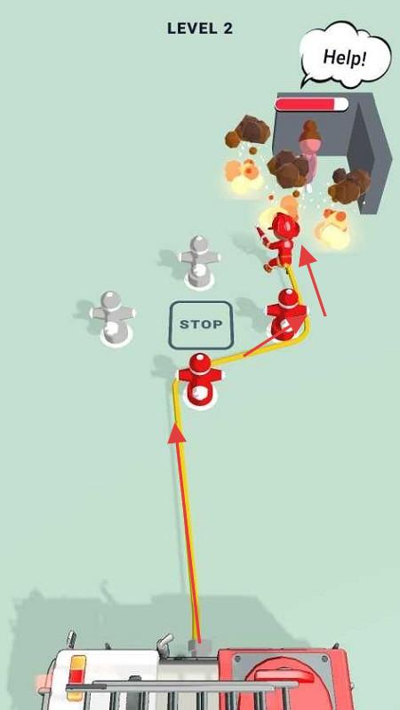 3、玩家操控红色小人抵达被困者位置后,利用水管喷水等方式清除障碍,完成救援任务,推进游戏进程。