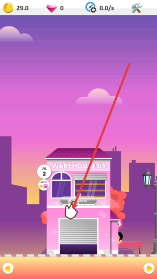 3、积累金币(如29.0)后,点击【WAREHOUSE01】的按钮,升级或建造仓库,扩展设施。