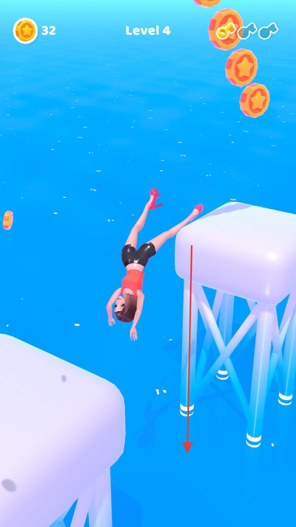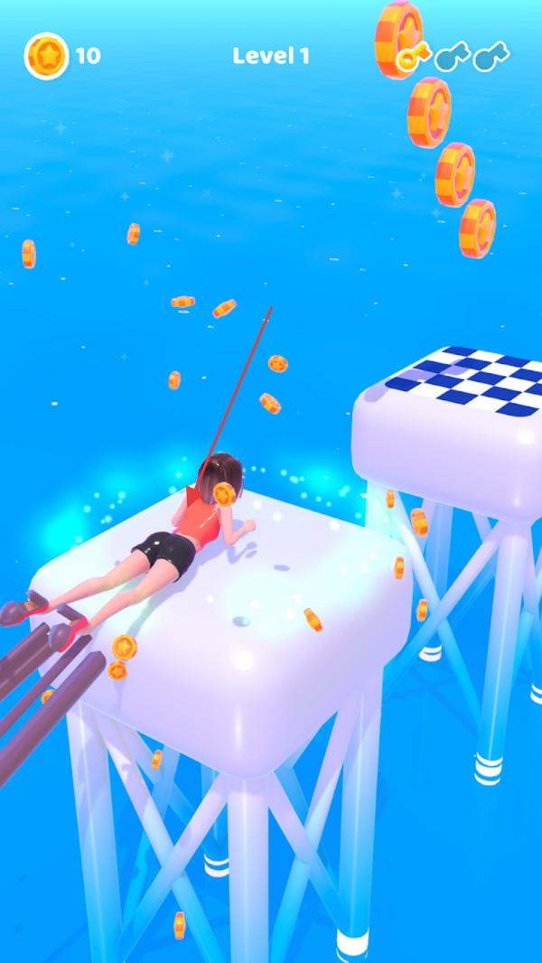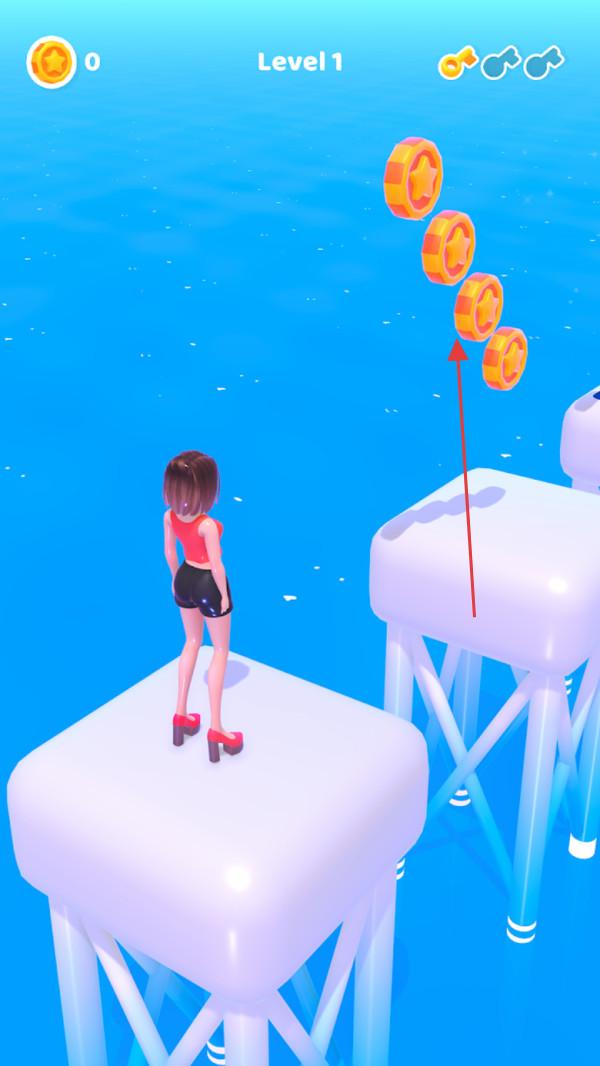 1、进入游戏关卡,如【Level1】,操控角色找准时机起跳,朝着有金币的方向跳跃,收集空中散落的金币,这是获取资源的基础操作。