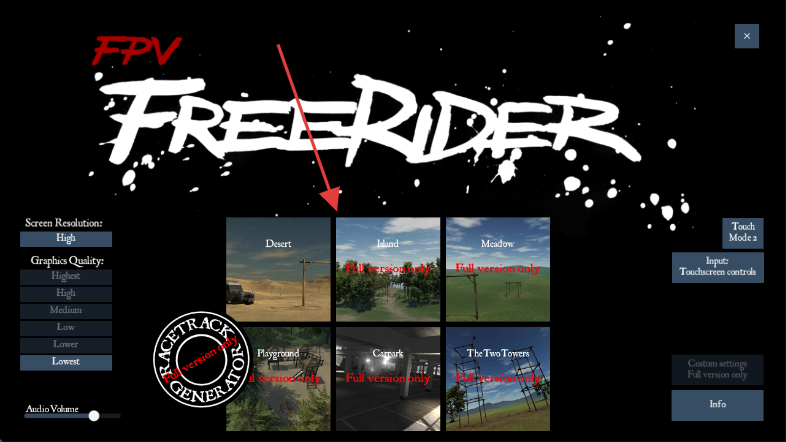 1、在【FPV Freerider】主界面,选择可玩场景,点击进入游戏。