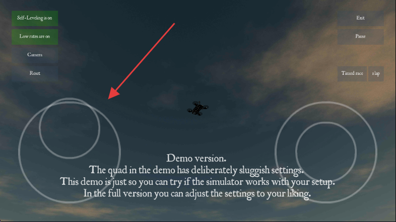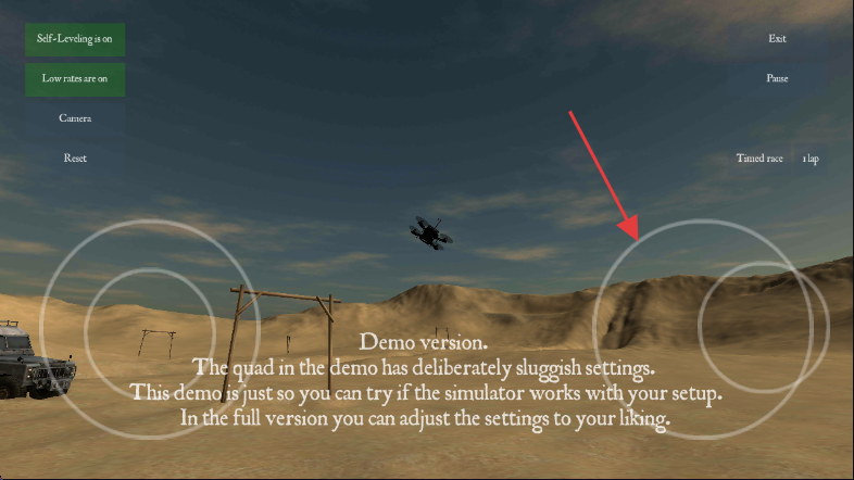 2、进入游戏后,了解这是演示版本,提示中说明演示版无人机设置有故意的延迟,仅用于测试模拟器与设备的兼容性。