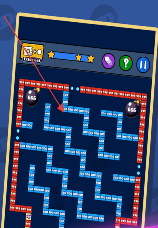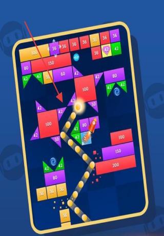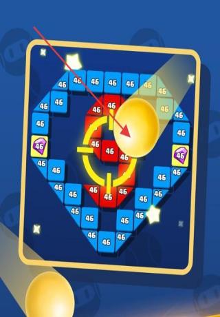 2、利用小球弹射轨迹,合理规划发射角度,使小球能多次撞击方块,如瞄准中心特殊区域(如红色带数字46区域),提高得分效率。