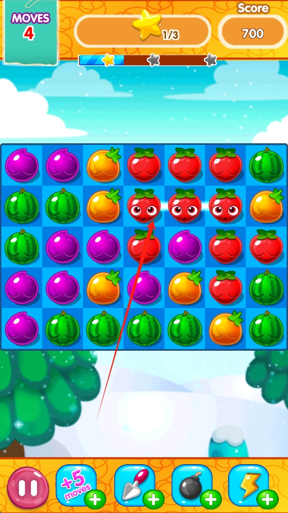 2、消除系统:通过交换相邻水果形成三个及以上相同连线,触发消除与连锁反应,特殊组合形成强力道具,成功完成目标获得星星奖励,连续消除触发连击加成,获得额外分数。