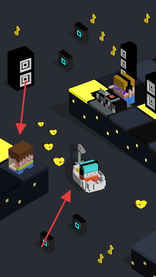 1、操控角色在不同风格场景中移动,在科技风场景中,收集【音符】【爱心】道具。