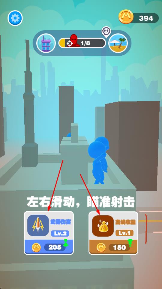 3、玩家可使用游戏中的金币对武器伤害、高额收益等属性进行升级,提升射击效果和游戏收益。