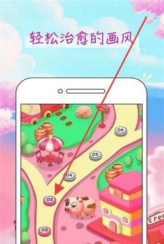 2、游戏中,跟随箭头指引,在充满童趣的场景中(如粉色道路关卡),照顾小猪,利用【轻松治愈的画风】带来的舒适感,沉浸游戏。