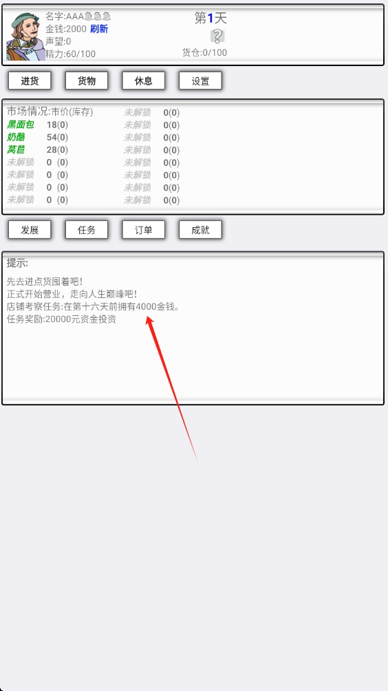 3、进入游戏主界面,查看市场情况和提示,先进行进货操作开启营业。
