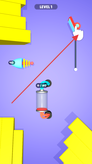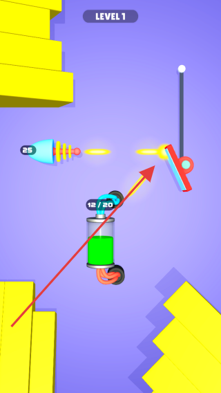 1、进入【LEVEL 1】关卡,按箭头指示操控剪刀装置,使其与场景中的蓝色火箭和能量罐互动,开始关卡任务。