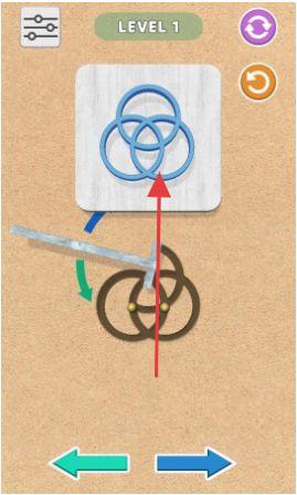 3、利用屏幕下方左右箭头控制机关,调整棕色环位置和状态使其与上方蓝色三环图案一致完成关卡任务。