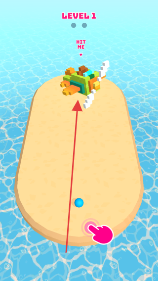 1、进入【LEVEL 1】关卡,按箭头方向滑动屏幕,操控蓝色小球撞击沙滩上的目标物,完成“HIY ME”任务。