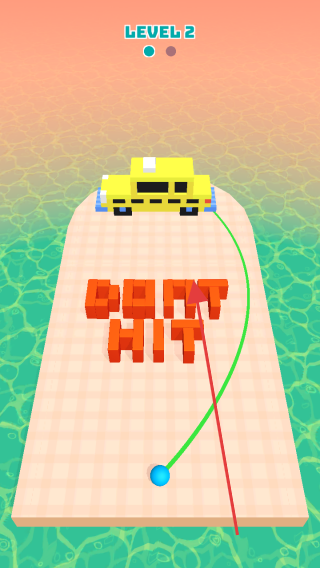 2、在【LEVEL 2】关卡,依照箭头指引,避开“DONT HIT”文字提示,控制小球移动路径,避免撞击黄色车辆。