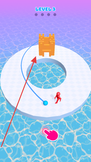 3、来到【LEVEL 3】关卡,按箭头所示滑动屏幕,让小球绕过红色小人,精准撞击环形平台上的城堡,顺利通过关卡。