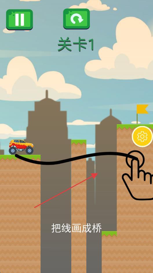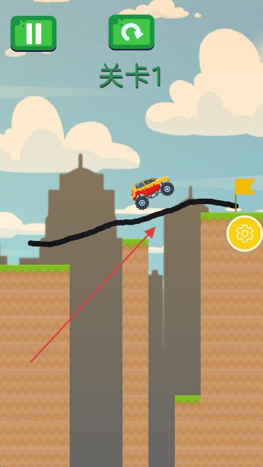 1、进入画桥车神,观察关卡地形与汽车起始位置,用手指在屏幕上拖动绘制桥梁,注意一次成型,确保桥梁两端稳固连接路基。