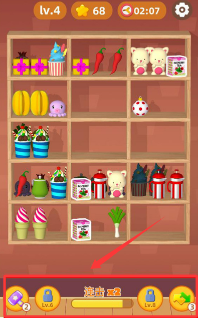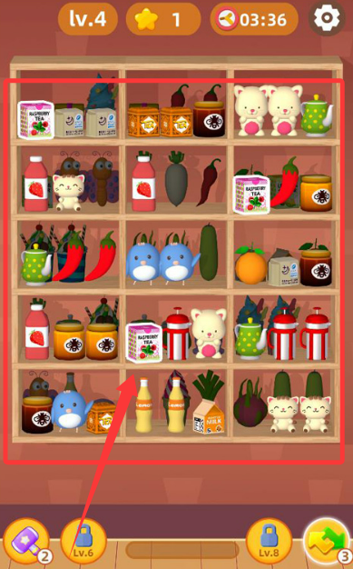 1、进入游戏中,需要找到相同的物品,把它们放到一个货架上即可消除。