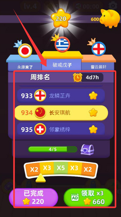 3、完成游戏后,还可以获得星星和金币,以及查看自己在本周的游戏排名。