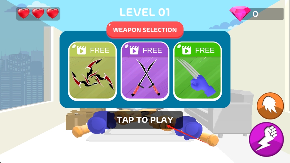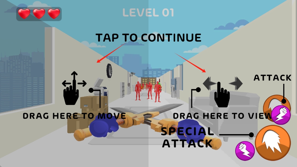 1、进入人类刺客世界,玩家置身于充满红色小人的初始场景,挑选顺手武器,滑动屏幕控制角色移动,开启战斗冒险。