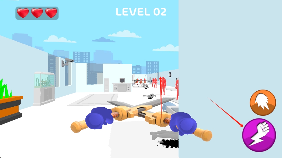 3、将关卡内所有红色小人尽数消灭,且自身存活下来,即可成功通关,解锁后续更具挑战性的场景与威力更强的武器。