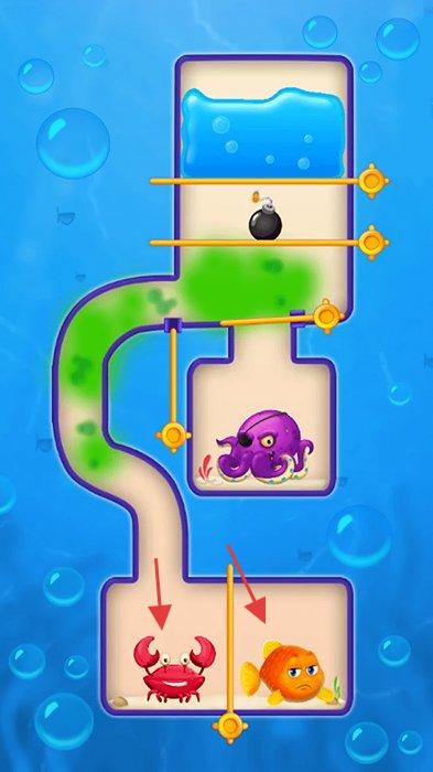 2、拉针解谜玩法:采用经典的拉针玩法,玩家需通过合理拉环、推开阻碍道路的横杆,为干净的海水开辟通路,同时注意堵住污水,拯救小鱼儿。