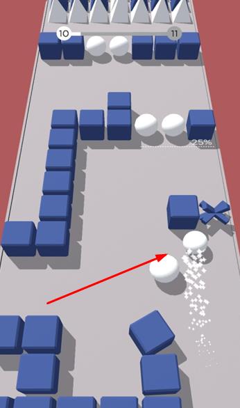 2、在赛道中,通过滑动屏幕控制小球左右移动、上滑跳跃、下滑滑行,巧妙躲避旋转锯齿、激光墙等动态障碍物。