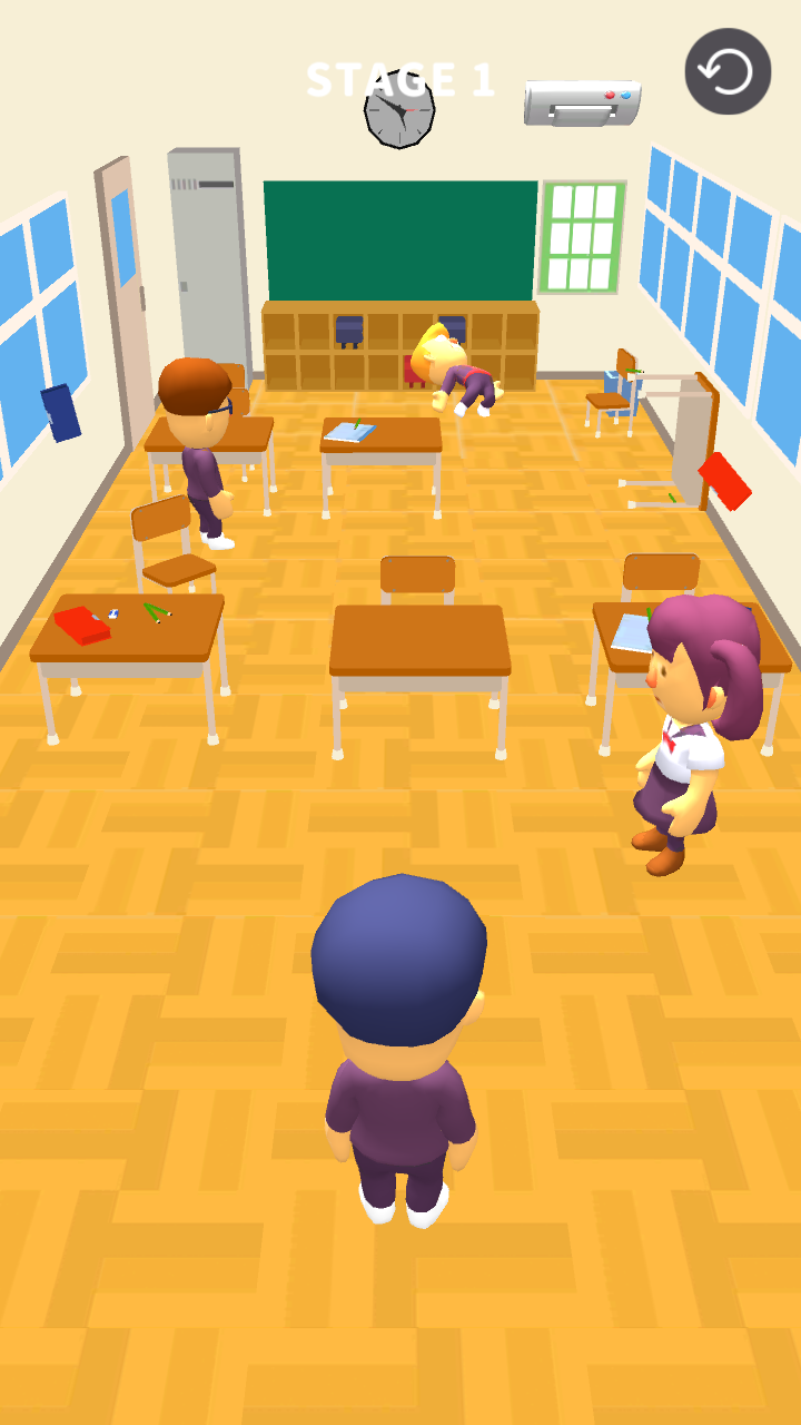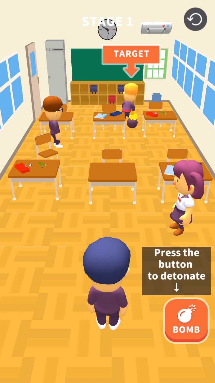 1、操控角色在教室场景移动,寻找【TARGET】目标,点击【BOMB】按钮引爆炸弹攻击目标。