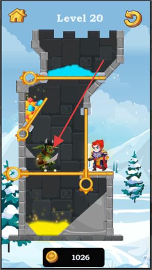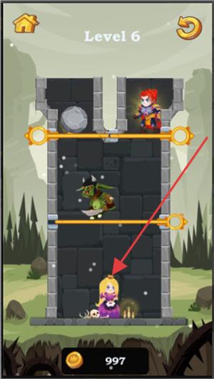 1、在游戏关卡中,观察城堡结构及角色位置,思考如何通过操作机关(如拉动圆环)来保障公主安全,避开怪物威胁。
