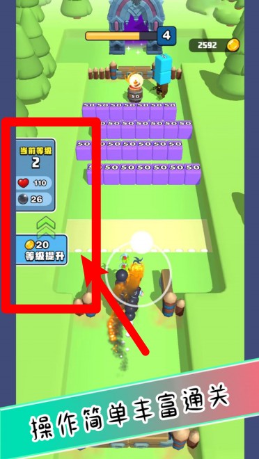 1.画面左侧显示当前角色等级、生命值、弹药数量以及金币数量。金币可以用于“等级提升”按钮来升级能力。