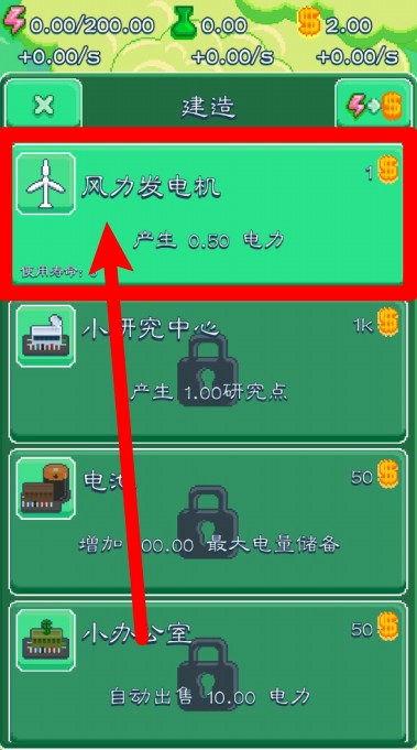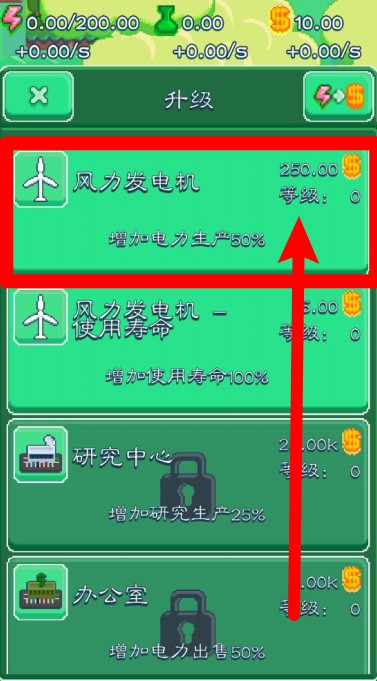 3.点击风力发电机升级选项,可提升电力产量50%,让发电能力大大增强。