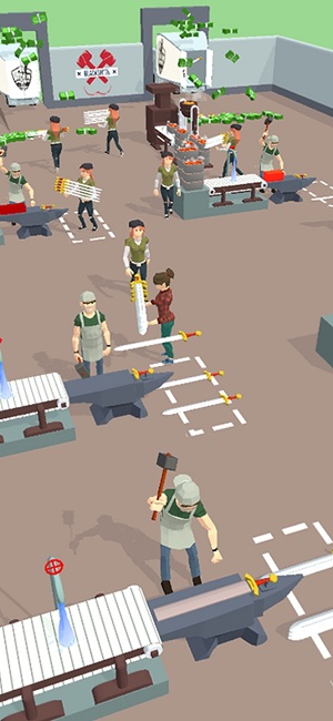 1、采用Q版卡通美术风格,铁匠铺场景细节丰富,武器造型夸张有趣。从简陋的锻造台到豪华工作间,场景变化展现成长轨迹。