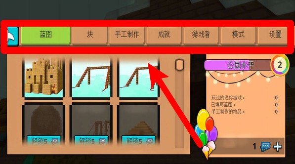 3.点击上方标签选择不同功能区域,自由切换蓝图、块、手工制作等模式。