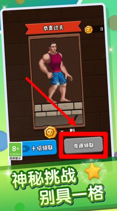 3.通关后点击「普通领取」按钮,获得奖励金币,存入账号余额中。