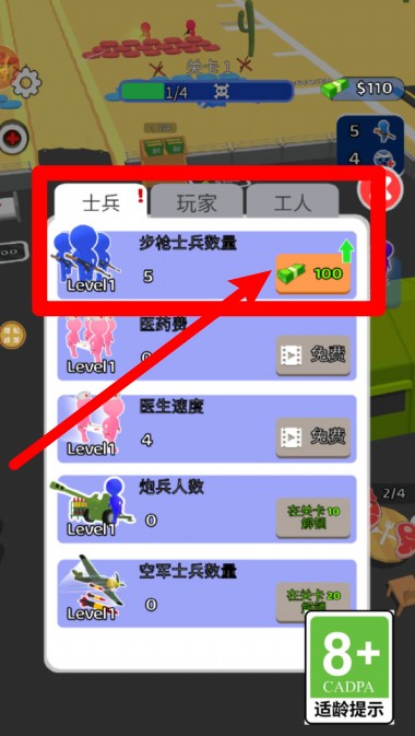 3.点击「步枪士兵数量」用金币购买步兵。步兵是基础战斗单位,攻速快,数量优势明显,适合作前排肉盾。