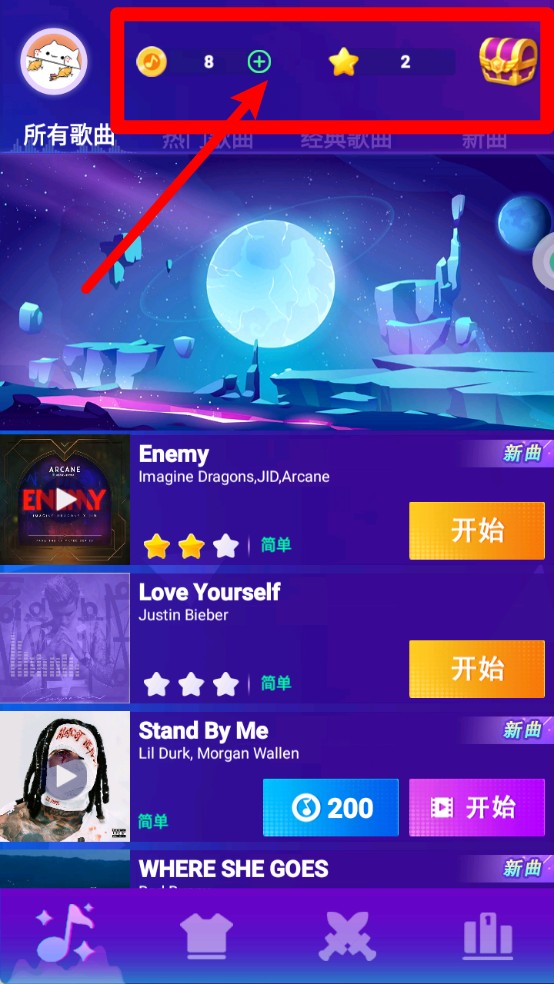 3.上方会显示你的金币和星星数量,这些可以用来解锁更多歌曲、购买炫酷道具,别浪费。