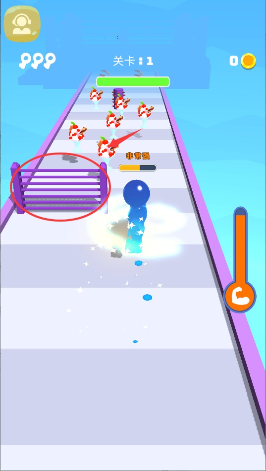 1、收集食物成长 控制橡皮人吃掉路上的各种食物,吃得越多体型越大。体型变化会影响移动速度和碰撞效果,要合理控制。