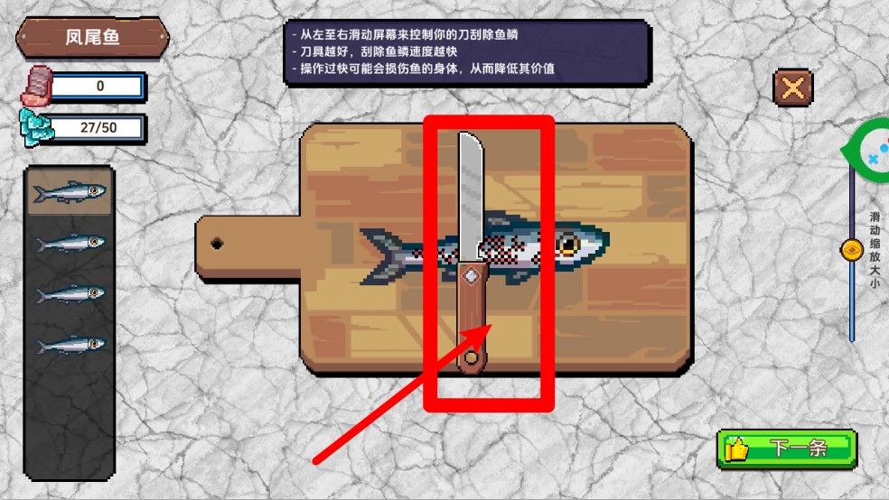 2.滑动屏幕让刀子从鱼尾到鱼头顺势去除鱼鳞,动作要平稳。