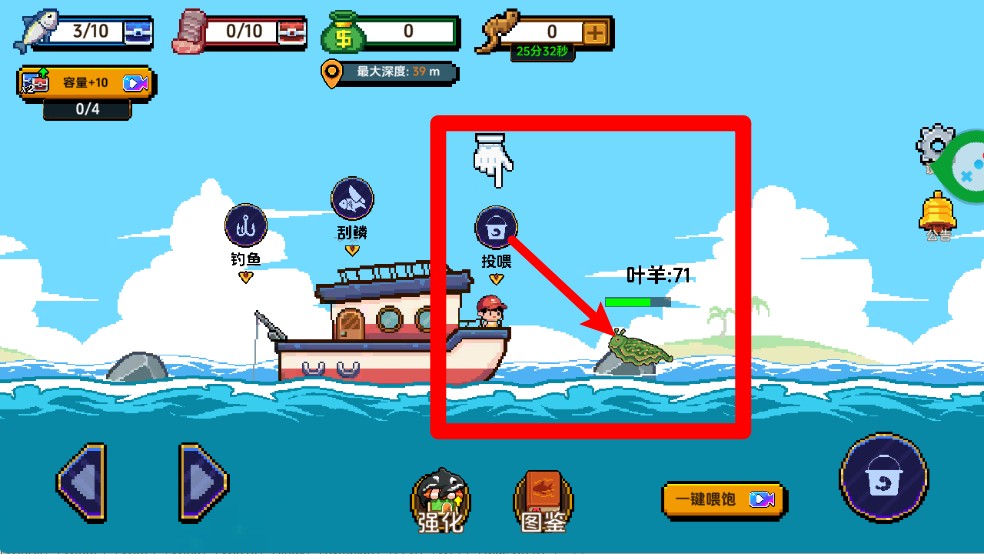 3.点击投喂按钮将饵料投入海中,可以吸引附近的海洋生物靠近。