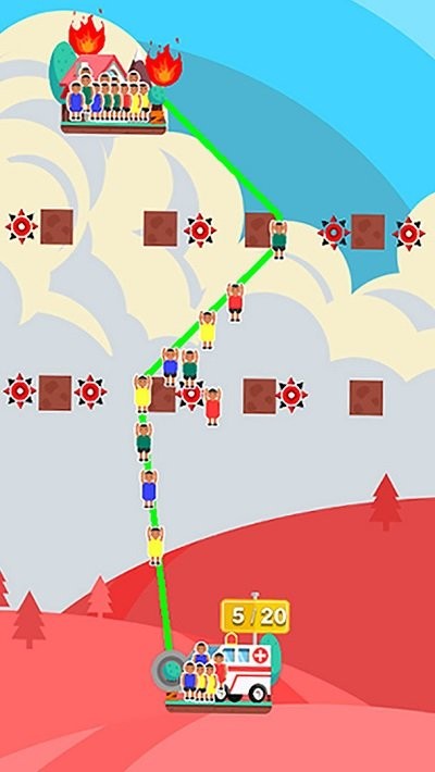 1、创新绳索救援玩法,通过画线搭建安全通道。玩法简单但充满策略性,需要巧妙规划路线。每关都有不同机关陷阱。
