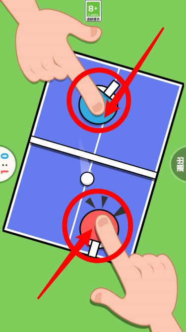 1.用手指点击蓝色或红色球台控制球拍,调整发球方向和角度。