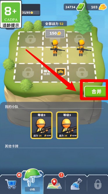 1.点击「合并」按钮可以升级相同角色士兵,提升战力和防御效果。
