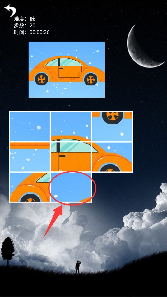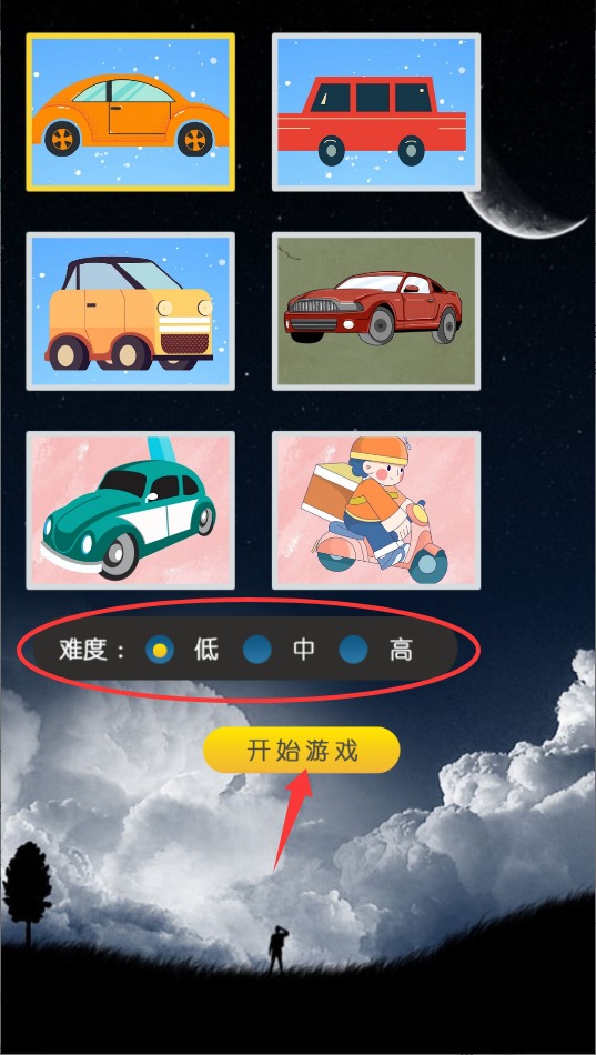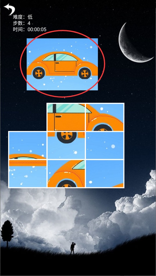 1、进入游戏后先挑选合适的挑战等级,点击对应难度的开始按钮即可载入拼图界面,屏幕会显示初始分割状态。