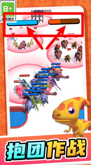 2.观察红蓝条:蓝色条代表己方恐龙部队血量,保持蓝条充足是获胜关键,避免己方阵亡。