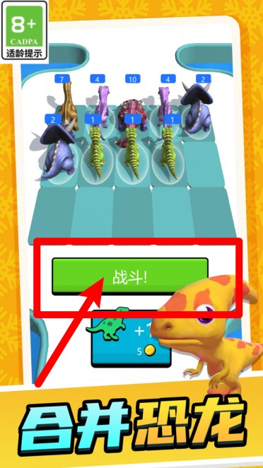 3.点击战斗按钮进入战斗模式,带领合并后的恐龙军团挑战敌人,体验合并的爽感。